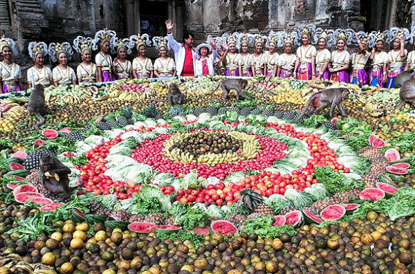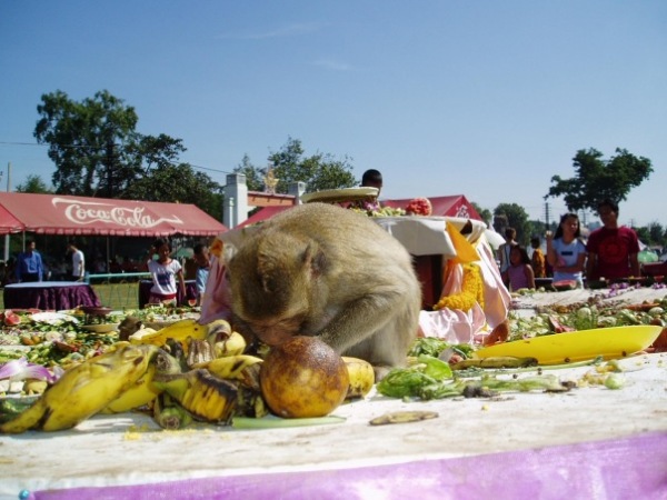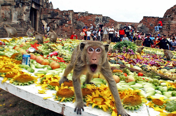 Талианд - родина необычных традиций и праздников. Одна из них - обезьяний банкет. Раз в год 600 макак приглашаются к обеду - на столе диаметром 7 метров их ждут 2 тонны еды. Так жители города Лопбури благодарят обезьян за победы в былых войнах.