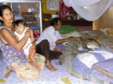 Можно ли представить огромного варана в качестве соседа по постели? Семья в Ратчабури преспокойно живет с такой вот тварью уже больше месяца. Банчу Ротчум и его семья обнаружили варана еще 17 ноября – с тех самых пор рептилия отказывается покидать «завоеванные» апартаменты, ест с одного стола с людьми и спит с ними же. Причина такой внезапной любви несколько неожиданна: оказывается, в деревне, стоящей на берегу канала, не так давно случилось счастливое событие. Варан, зашедший в дом номер 59, принес удачу в лотерее – выиграла именно эта комбинация. Сейчас жители деревни ждут очередного розыгрыша, чтобы купить билет с номером 127 – в доме с таким номером и проживает рептилия в настоящий момент.